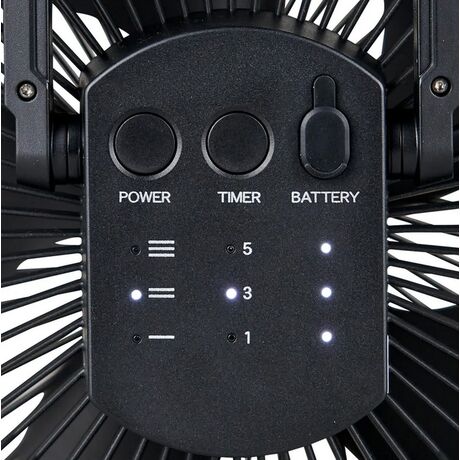 Λυχνίες Λειτουργίας: Παρακολουθήστε τις ρυθμίσεις σας με μια ματιά με καθαρές, φωτεινές ενδεικτικές λυχνίες που εμφανίζουν την τρέχουσα ταχύτητα του ανεμιστήρα, την επιλογή του χρονοδιακόπτη και το υπολειπόμενο επίπεδο της μπαταρίας.
