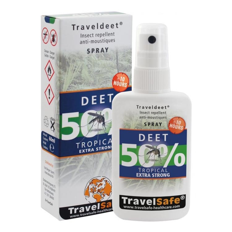 Προστατεύει το δέρμα από τα ευρωπαϊκά και τροπικά κουνούπια, μύγες, αλογόμυγες, ακάρεα του φθινοπώρου, σκνίπες και τα τσιμπούρια. Το δραστικό συστατικό του Travel DEET είναι Diethyl-m-toluamide (DEET). Το σπρέι με DEET 50%, είναι ισχυρό για μακράς διάρκειας προστασία.