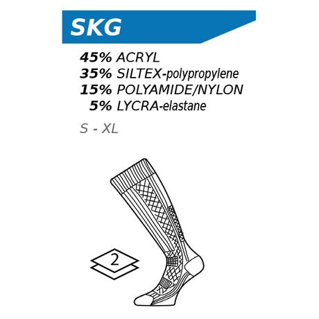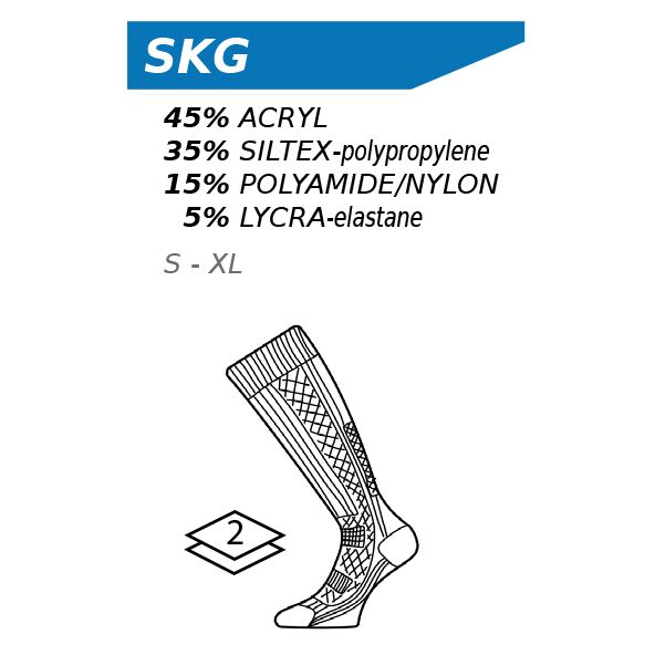 Η θερμομονωτική κάλτσα SKG-808 της Τσεχικής εταιρείας Lasting είναι μια κάλτσα με ύψος μέχρι το γόνατο και είναι ιδανική για χειμερινά sports όπως ski και snownoard (-10 C έως +10 C). Διαθέτει διπλή ενίσχυση στα σημεία υψηλής πίεσης όπως η πατούσα, τα δάχτυλα και η φτέρνα, καθώς επίσης παρέχει και καλύτερη θερμική μόνωση από άλλες αθλητικές κάλτσες. Αυτή η κάλτσα θα προστατεύσει τα πόδια σας και θα εμποδίσει να δημιουργηθούν κάλοι και φουσκάλες έτσι ώστε να απολαμβάνετε περισσότερο το αγαπημένο σας sport.