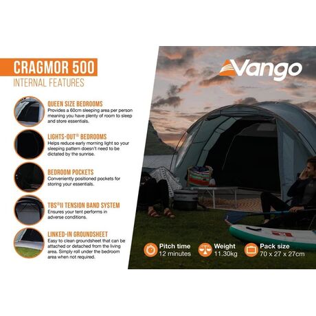 Η Cragmor 500 είναι μια σκηνή θόλου 5 ατόμων, με τρεις μπανέλες, η οποία διαθέτει μια μεγάλη σκεπαστή βεράντα με δάπεδο που είναι τέλεια για την αποθήκευση του εξοπλισμού ή για την προστασία σας από τα καιρικά στοιχεία. Η κρεβατοκάμαρα διαθέτει ύφασμα Lights-Out® το οποίο έχει σχεδιαστεί για να εμποδίζει το φως να εισέλθει στην σκηνή νωρίς το πρωί και να σας ξυπνήσει. Η σκηνή Cragmor είναι μια ευέλικτη σκηνή που είναι ιδανική για μικρές οικογένειες, ζευγάρια και φίλους για τις κατασκηνώσεις το Σαββατοκύριακο ή το φεστιβάλ.